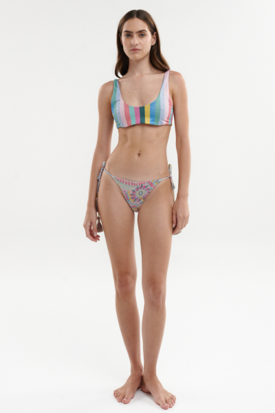 Bottom básico de amarrar con corte moderado hecho en tela brillante estampada. Composición de la tela: 58,3% Poliéster 36,7% Polietileno reciclado 5% Elastano.
