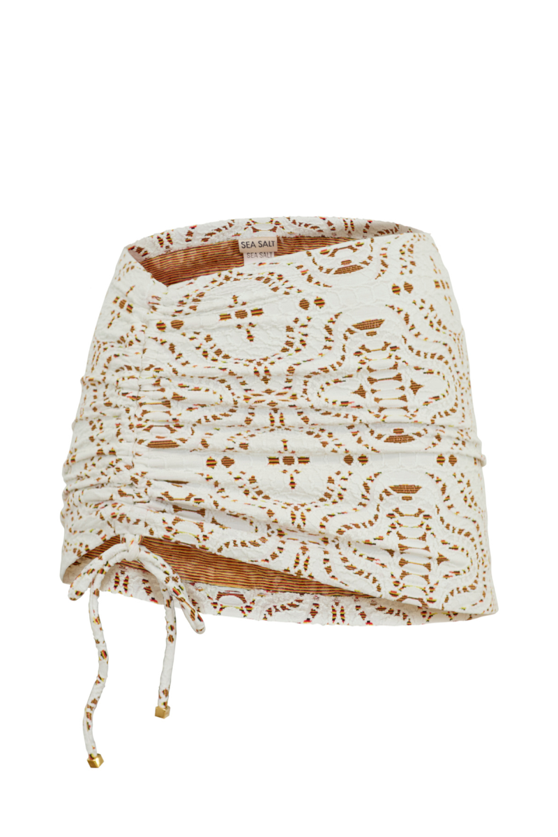 Falda corta con recogido a un lado hecha en una tela suave y texturizada. Muy femenina y versátil, perfecta para combinar tus looks playeros. Composición de la tela: 65% Poliamida 25% Poliéster 10% Elastano.