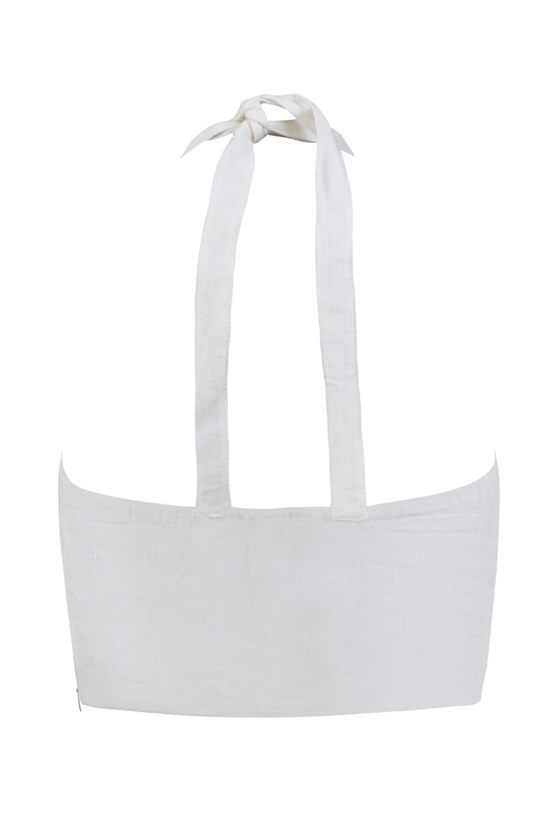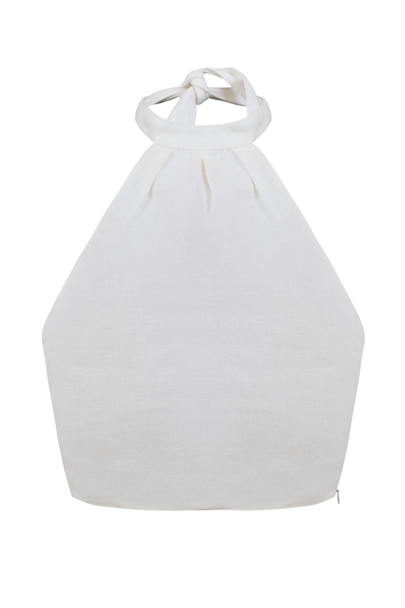 Nuestro top Abril es un top de cuello alto tipo halter con amarre en cuello en posterior. Composición de la tela: 100% Lino.